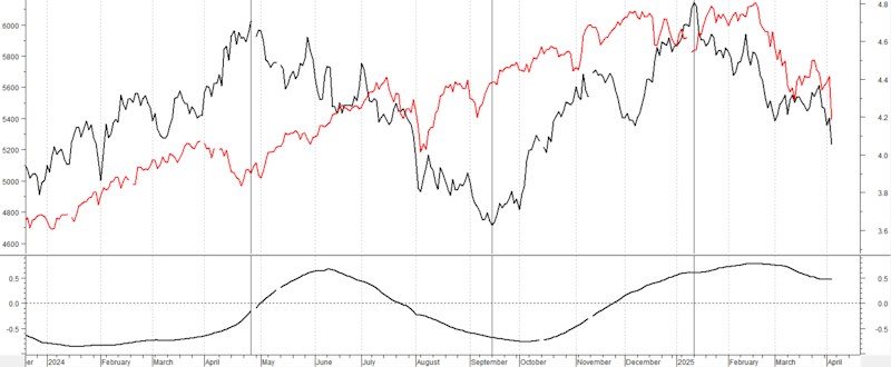 During these four phases, the S&P 500 experienced near-constant growth until its recent peak on February 19 (red arrow). The correlation chart below confirms the lack of a consistent relationship between the two markets, as also evident from the graphs. While the “natural” correlation is expected to be inverse, since the September 2024 yield low, a direct correlation has emerged: the T-Note yield and S&P 500 are both declining.