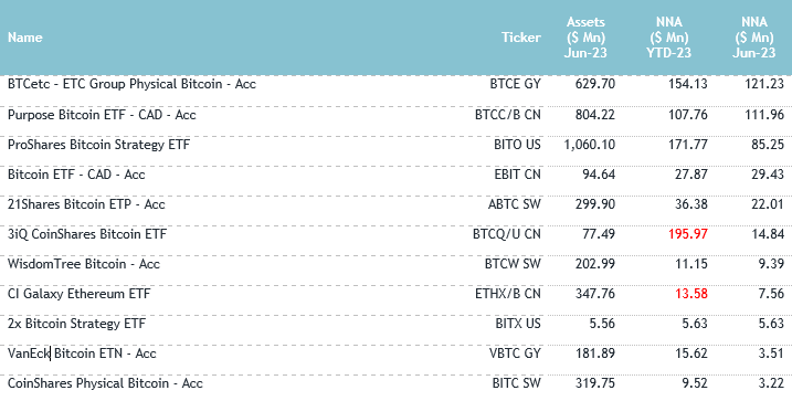 - Year-to-date net inflows of $242 Mn are the third highest on record, after YTD net inflows of $4.06 Bn for 2021, followed by YTD net inflows of $567 Mn for 2022.