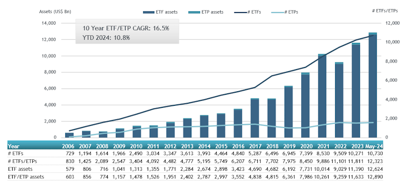 - Assets invested in the global ETFs industry reached a record of $12.89 Tn at the end of May 2024 beating the previous record of $12.70 Tn at the end of March 2024.