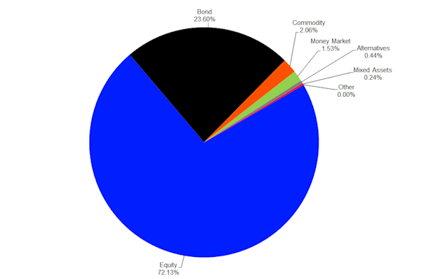 As for the overall structure of the European ETF industry, it was not surprising equity funds (€1,127.8 bn) held the majority of assets, followed by bond funds (€369.0 bn), commodities products (€32.3 bn), money market products (€23.9 bn), alternatives products (€6.8 bn), and mixed-assets funds (€3.8 bn).